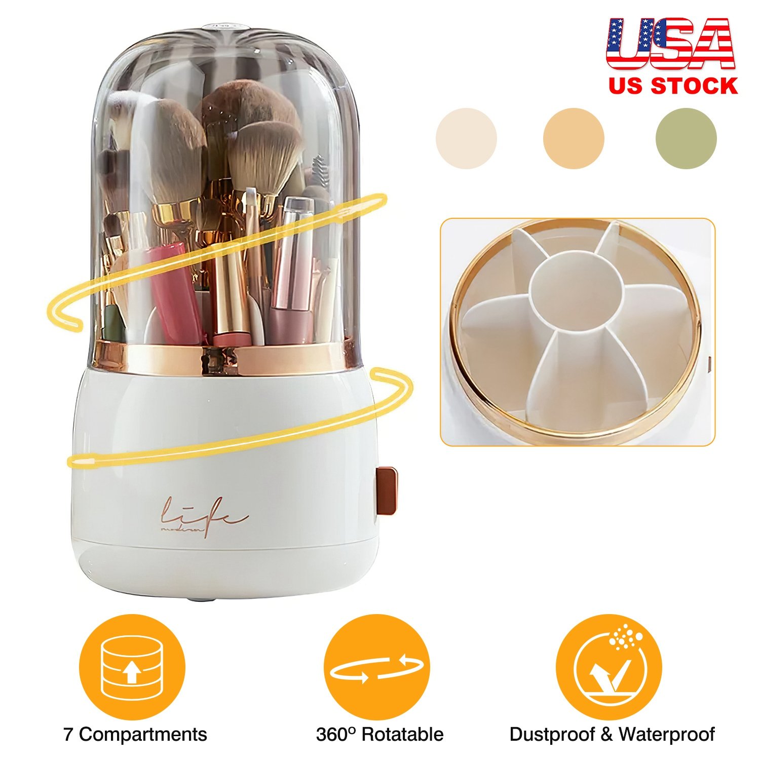 360° Rotating Makeup Brush Holder with Lid Makeup Organizer for Vanity Dustproof Makeup Brush Container with 7 Compartments